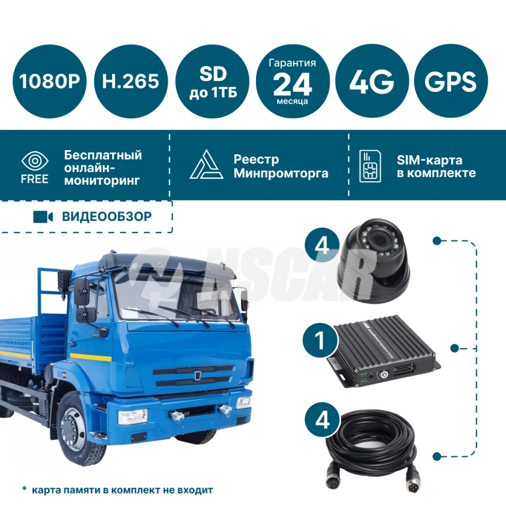 Комплект видеонаблюдения для грузовика NSCAR (4 видеокамеры) GT401_SD с опциями 4G+GPS/Глонасс (запись на SD)