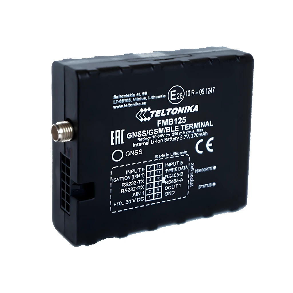 FMB125 оснащён Bluetooth и резервным аккумулятором. FMB125 предназначен для работы с различными устройствами по интерфейсам RS232 и RS485, например, цифровые датчики топлива (LLS), навигационное устройства Garmin, считыватели RFID и т. д.